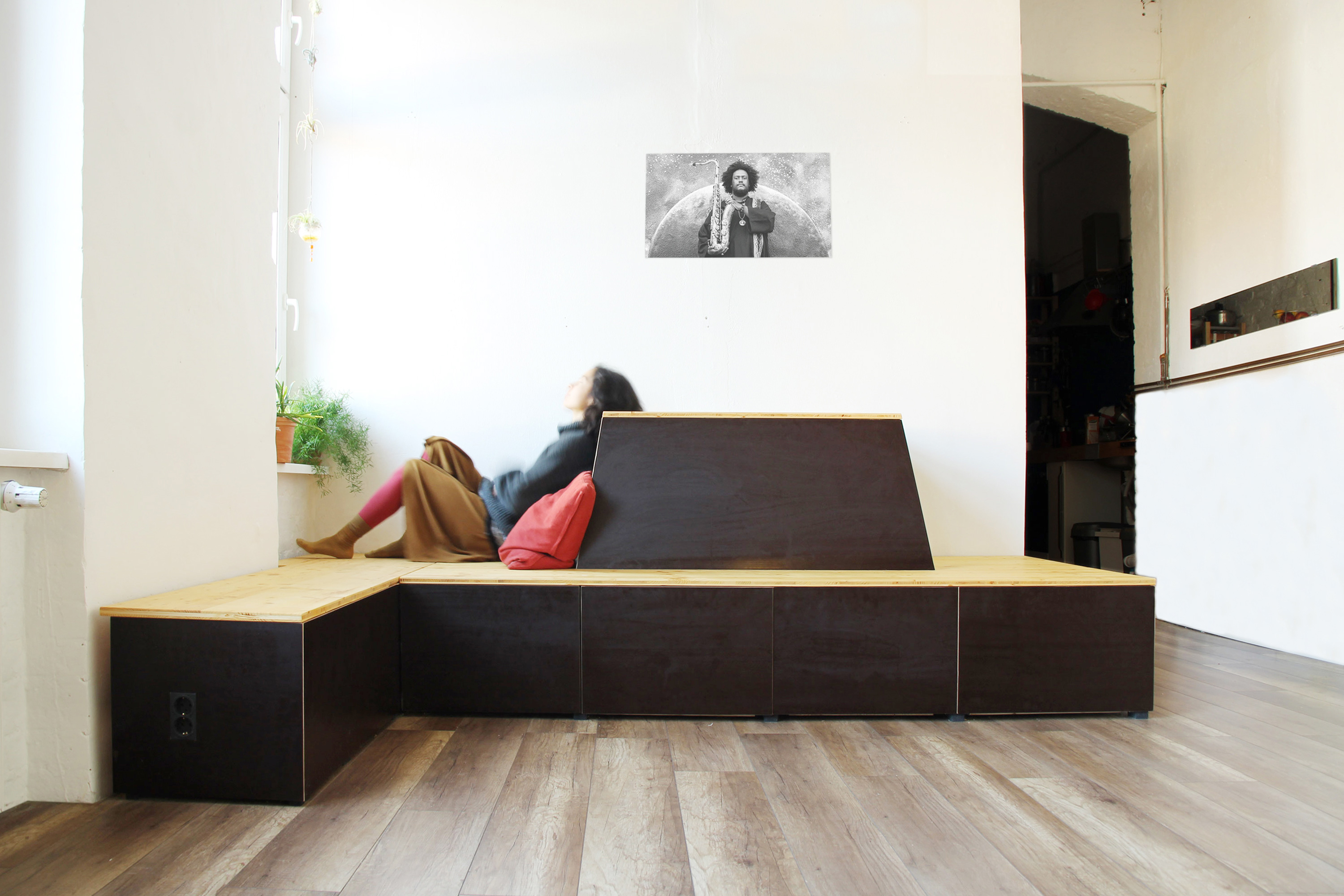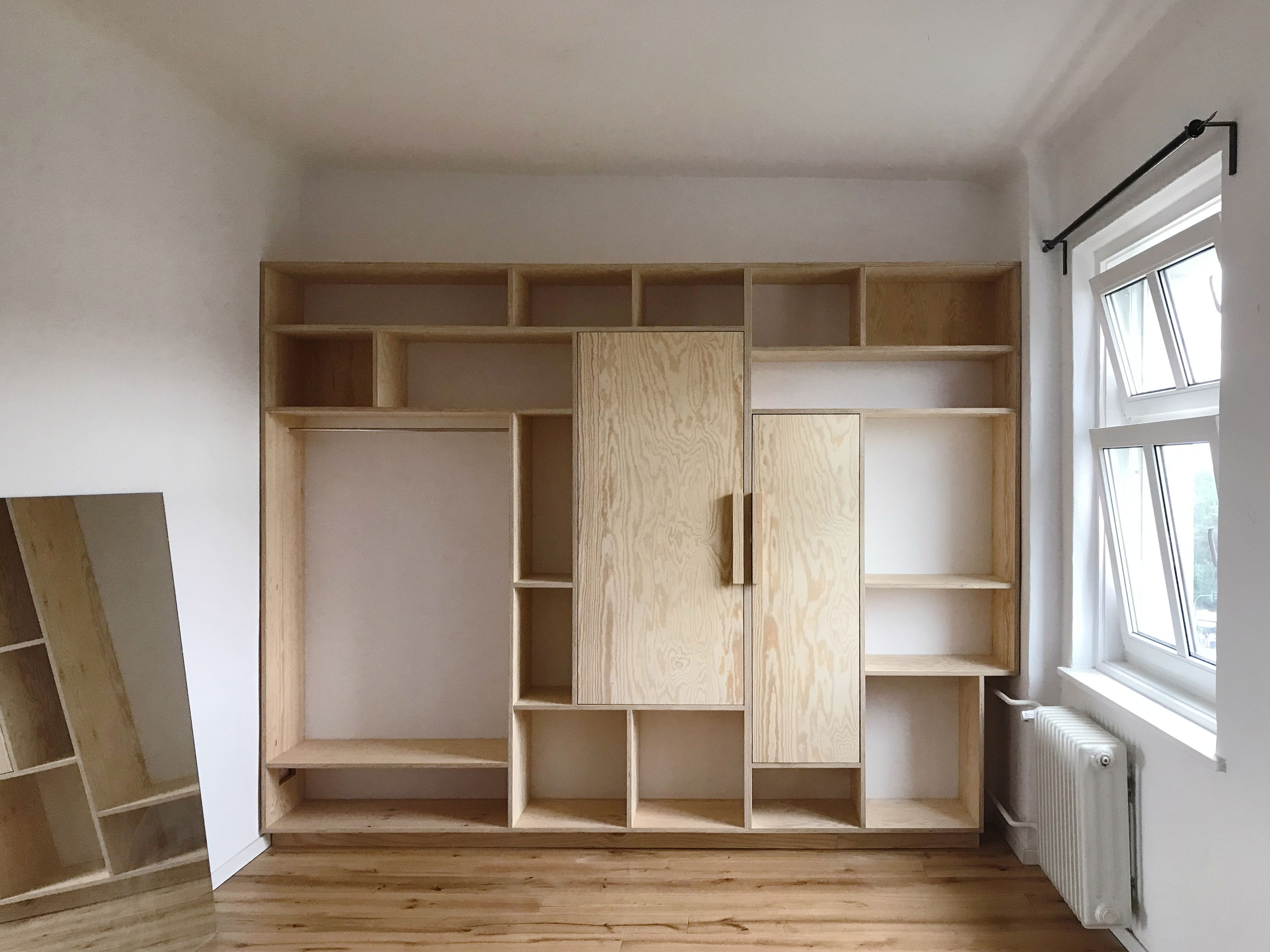 C had recently bought a flat. The first thing she did was to take down the wall separating between the living room/kitchen and the bedroom. After a while, she realized, if her bedroom was to stay open, she would need some nice storage solutions and some level of visual separation between the spaces. We designed a shelving system, with expansion tendencies. The deployable sideboard, acting as the main separation element, enables C to “keep her options open”. For budget reasons we divided the fabrication into 2 phases. Phase 1 is shown in the photos.