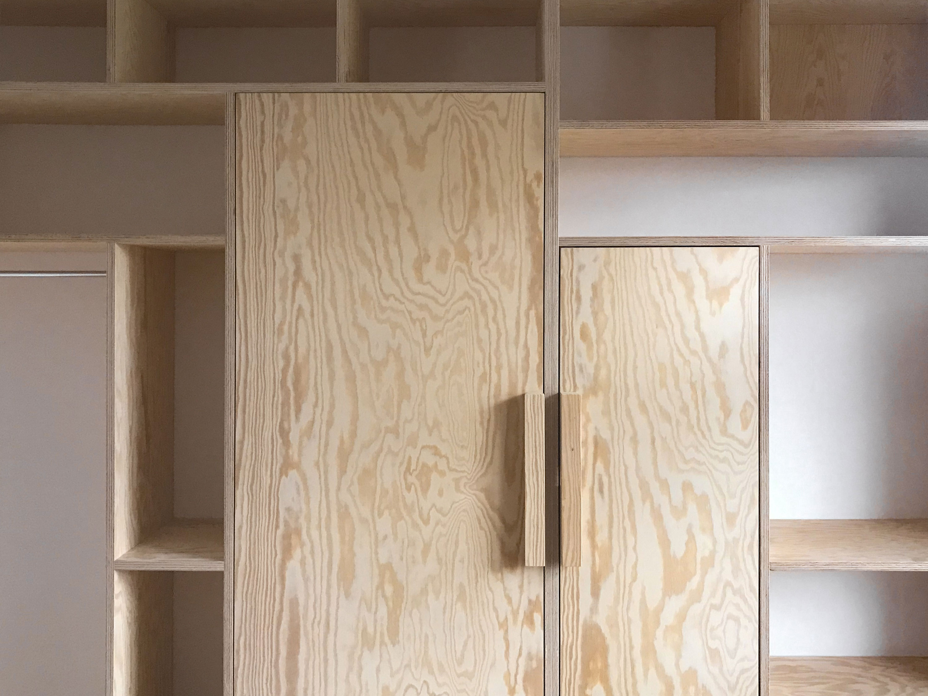 The bulky door handles are custom made and the doors are inset fitted, to expose the playful grid lines.